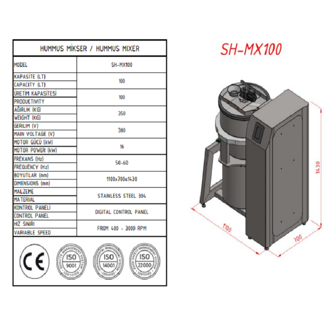 SH-MX100 Hummus Mixer (100L – Digital) – Technical Specifications